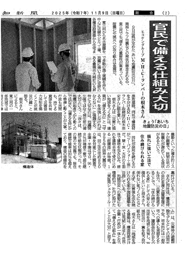 同社が採用を続けるのが「ツーバイフォー工法」だ。壁・床・天井の6面体で建物を包み込み、揺れを建物全体で受け止める「面構造」が特徴。1995年の阪神大震災では、同工法住宅約8900棟を対象にした調査で全壊・半壊はゼロ。96.8%が補修不要で居住継続可能な状態だった。その後の大地震でも、居住継続可能率は90%を超えており、構造の信頼性を裏付けている。さらに同社は、構造材の自社生産と品質管理にも注力。「品質を徹底することで、『住み続けられる家』としての安心を提供したい」と根木さん。倒れない家づくりにとどまらず、災害後も住み続けられる家や施設建築を目指している。