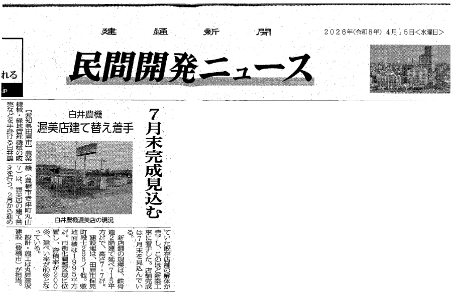 農業機械・緑地管理機械の販売などを手掛ける白井農機(豊橋市老津町丸山7)は、渥美店の建て替えを行う。2月から進めていた既存店舗の解体が完了し、このほど新築工事に着手した。店舗完成は7月末を見込んでいる。